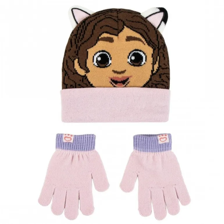 El gorro, predominantemente en tonos marrón y rosa claro, es un complemento encantador que ofrece tanto estilo como funcionalidad. Los guantes a juego son de un delicado color rosa con puños en tono lila, proporcionando un ajuste cómodo y seguro. Este conjunto es el regalo ideal para cualquier joven fan de Gabby’s Dollhouse, garantizando horas de juego y aventuras al aire libre sin pasar frío.