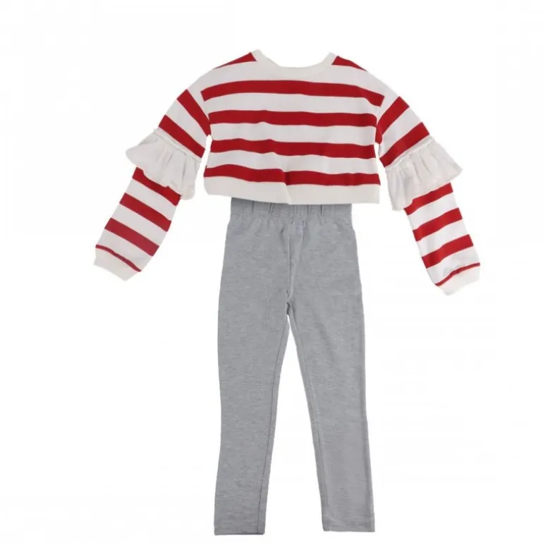 Descubre el encantador conjunto de 2 piezas Minnie, ideal para niñas de 3 a 6 años. Este set incluye una camiseta de rayas rojas y blancas con un alegre estampado de Minnie Mouse en el centro. Las mangas largas tienen un detalle de volantes que añade un toque especial. Los leggins en tono gris cuentan con un divertido diseño de Minnie en la parte inferior, perfecto para las pequeñas fanáticas de Disney. Fabricado en 60% algodón y 40% poliéster, ofrece comodidad y durabilidad.