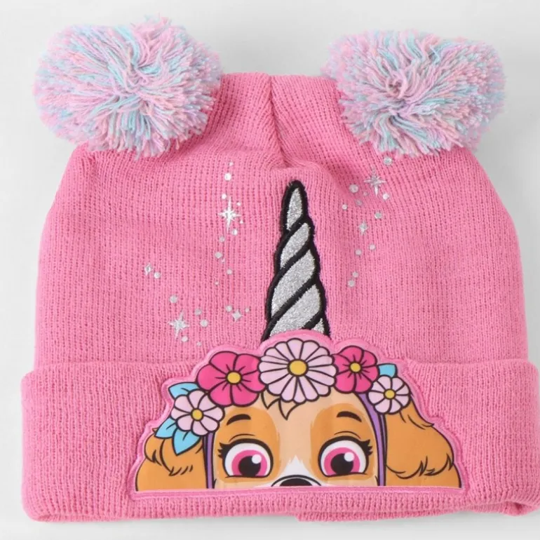 El gorro rosa destaca con un diseño de personaje de Paw Patrol con un cuerno de unicornio brillante y detalle de flores, acompañado de pompones multicolores que le añaden un toque divertido. La bufanda a rayas en tonos rosa lleva una imagen del personaje, aportando cohesión al conjunto. Los guantes cuentan con una estrella bordada en el centro, combinando perfectamente con el resto de las piezas.