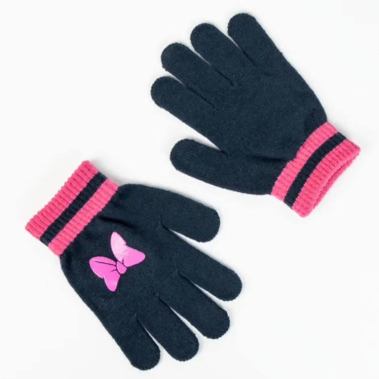 Los guantes, también en un elegante color negro, tienen un diseño moderno con puños en rosa y un detalle de la icónica moña de Minnie, aportando un estilo único y divertido. Están fabricados con una mezcla de 50% acrílico y 50% poliéster, lo que garantiza calidez y comodidad, ideal para el invierno.