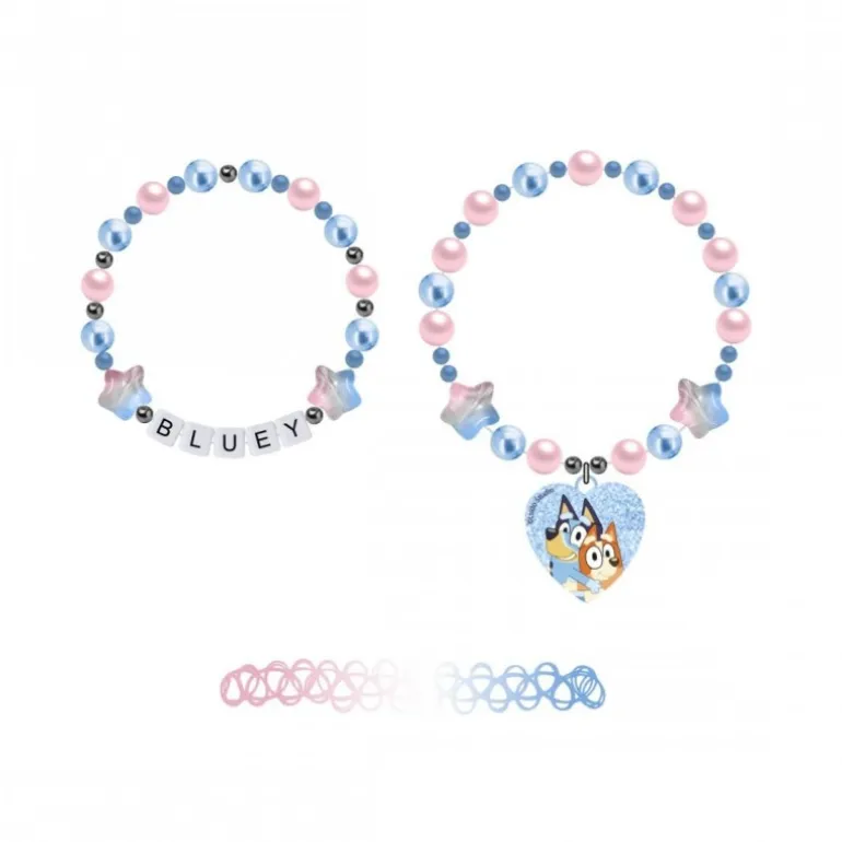 Descubre el encantador conjunto de pulseras Bluey, ideal para los pequeños amantes de la famosa serie de televisión. Este set incluye dos pulseras elásticas multicolor adornadas con cuentas en tonos pastel de rosa, azul y morado, haciendo de este conjunto un accesorio vibrante y llamativo. Una de las pulseras destaca con un colgante en forma de corazón que muestra a Bluey, aportando un toque especial que fascinará a los niños. La otra pulsera cuenta con letras que forman el nombre de ‘BLUEY’, invitando a los pequeños a llevar siempre a su personaje favorito consigo. Fabricadas con un cómodo material elástico, estas pulseras son perfectas para manos pequeñas, asegurando comodidad durante todo el día y estimulando el juego y la creatividad.