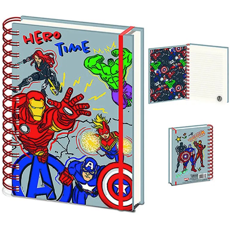 La portada presenta un diseño vibrante con los icónicos personajes de los Avengers, incluyendo a Iron Man, Capitán América, Hulk y Black Widow, en un fondo gris que resalta sus colores llamativos y detalles artísticos. El cuaderno está encuadernado con una espiral roja que le da un toque dinámico y moderno.