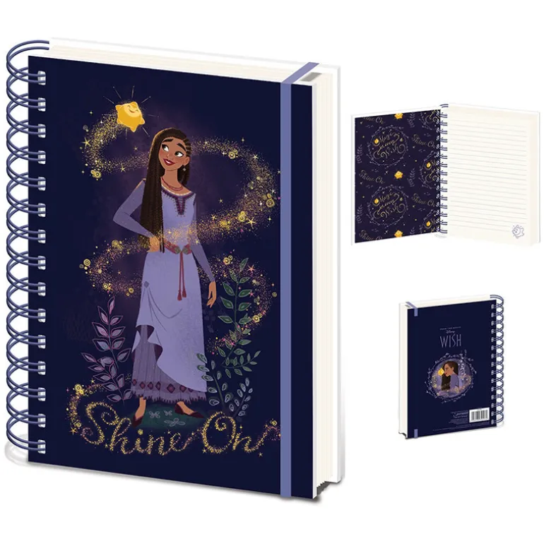 Descubre este cuaderno de espiral A5 con diseño «Wish (Shine On)», perfecto para los amantes de Disney. Tiene una portada de color azul oscuro que destaca por una ilustración de una figura femenina rodeada de destellos dorados y decorada con hojas en tonos morados y verdes. El texto «Shine On» en la parte inferior de la portada añade un toque inspirador al diseño.