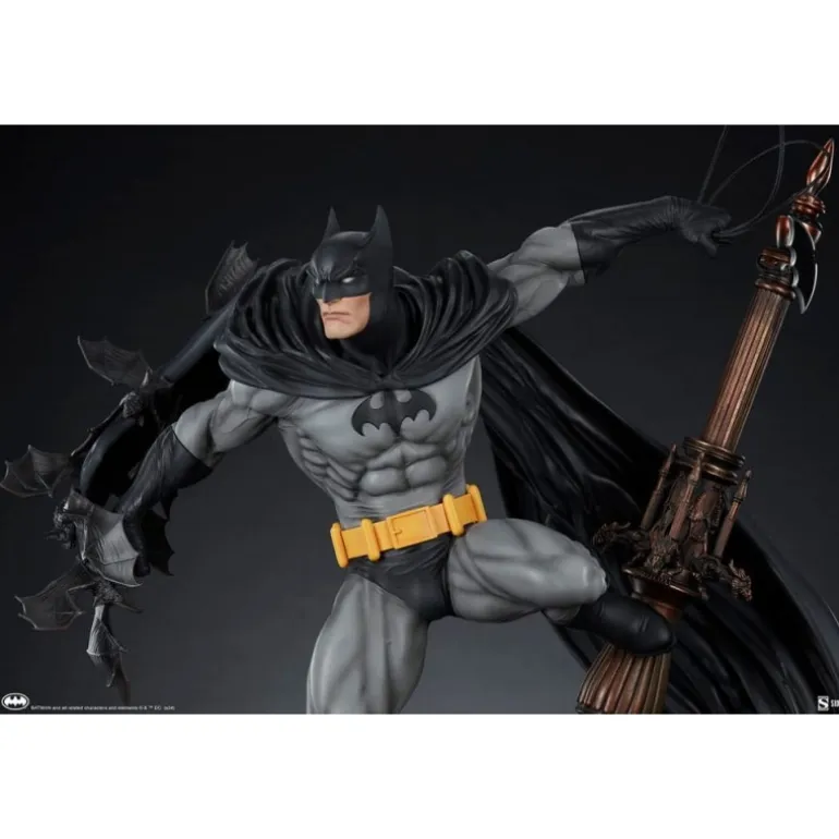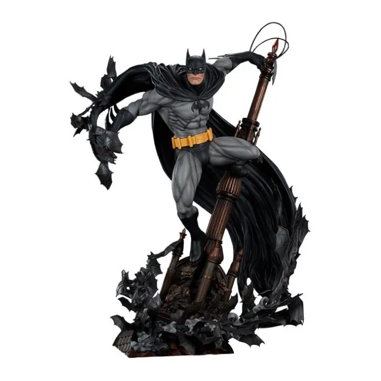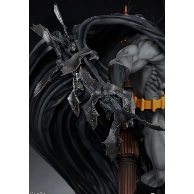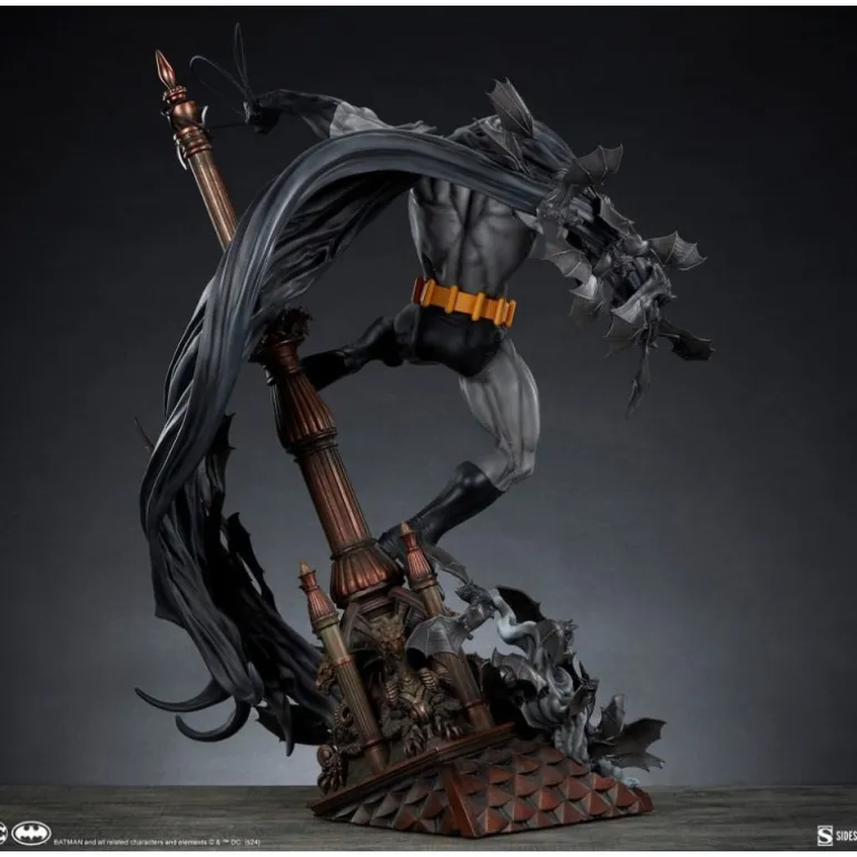 La estatua muestra a Batman en una pose dinámica, destacándose sobre una detallada base que evoca la arquitectura gótica de Gotham City. La atención al detalle es asombrosa, desde el texturizado del traje hasta los pliegues de la capa, todo trabajado con gran esmero para capturar la esencia del icónico caballero oscuro.