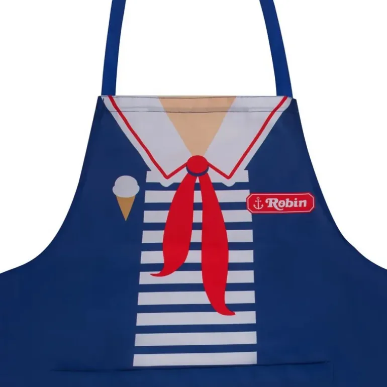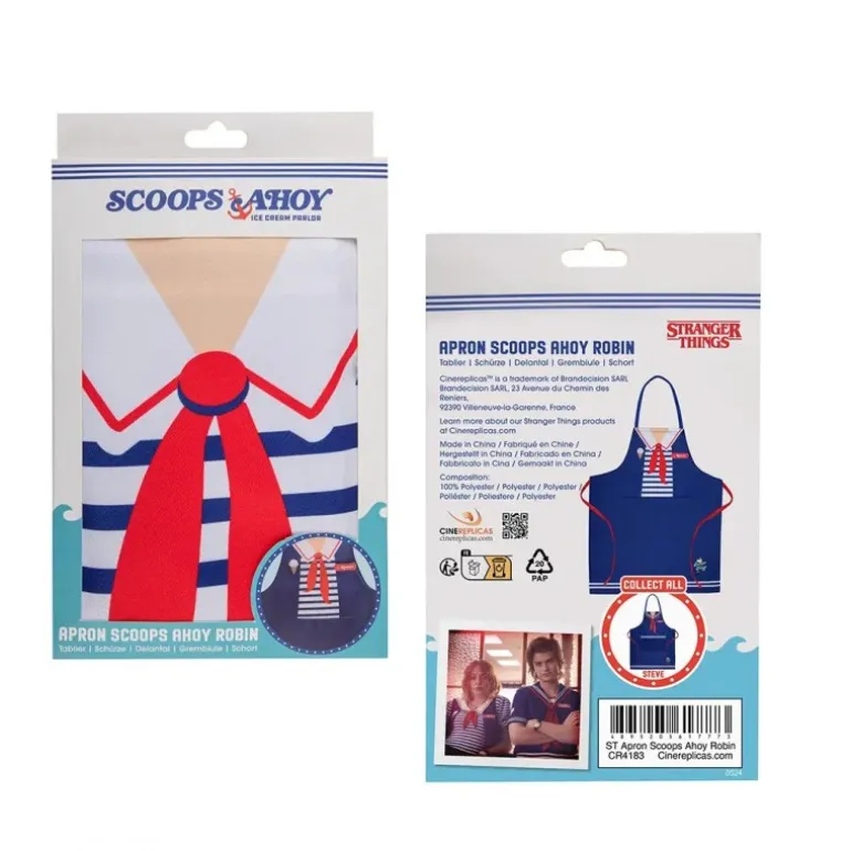 El delantal Scoops Ahoy de Robin es una auténtica pieza de colección inspirada en la icónica serie Stranger Things. Diseñado en un vibrante azul marino, este delantal presenta un elegante estampado de rayas blancas y detalles en rojo, simulando el uniforme característico de Scoops Ahoy. En el pecho, un distintivo lazo rojo añade un toque divertido y auténtico, junto con el nombre ‘Robin’ en una placa roja. Hecho de poliéster 100%, este accesorio no solo es visualmente atractivo, sino también duradero y fácil de limpiar, ideal para cualquier ocasión culinaria.