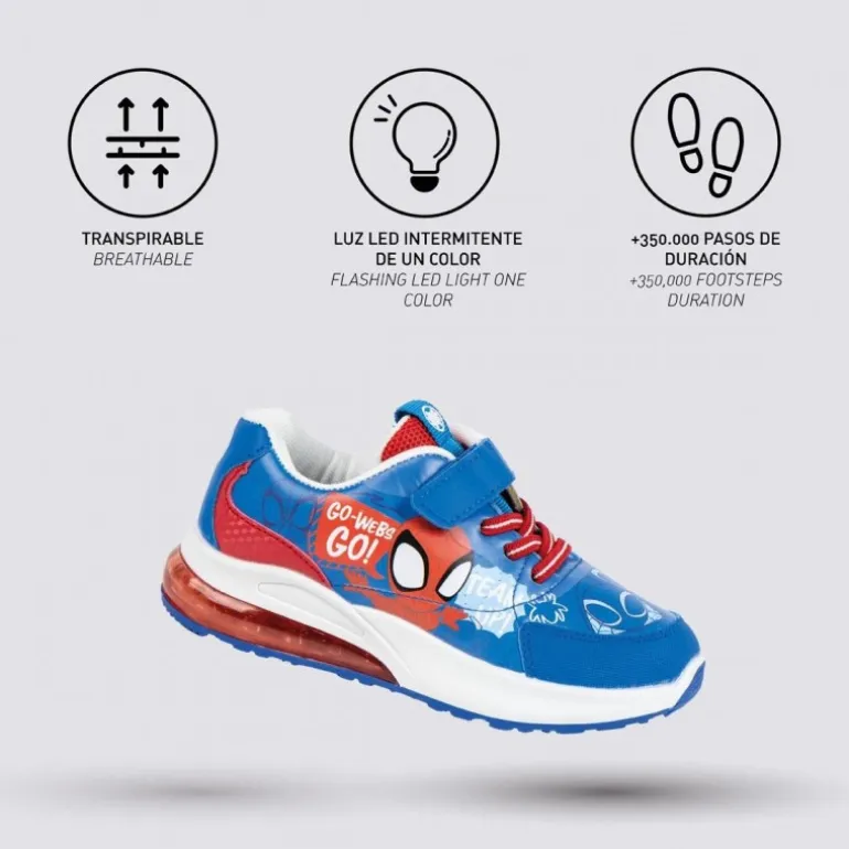 La suela de PVC incluye luces LED intermitentes que añaden diversión a cada paso, con una duración de más de 350,000 pasos. El cierre de velcro y los cordones elásticos facilitan el proceso de calzado, mientras que el interior acolchado asegura comodidad durante todo el día.