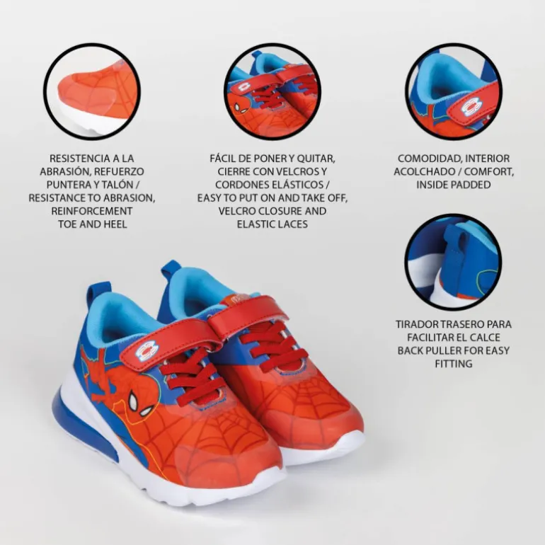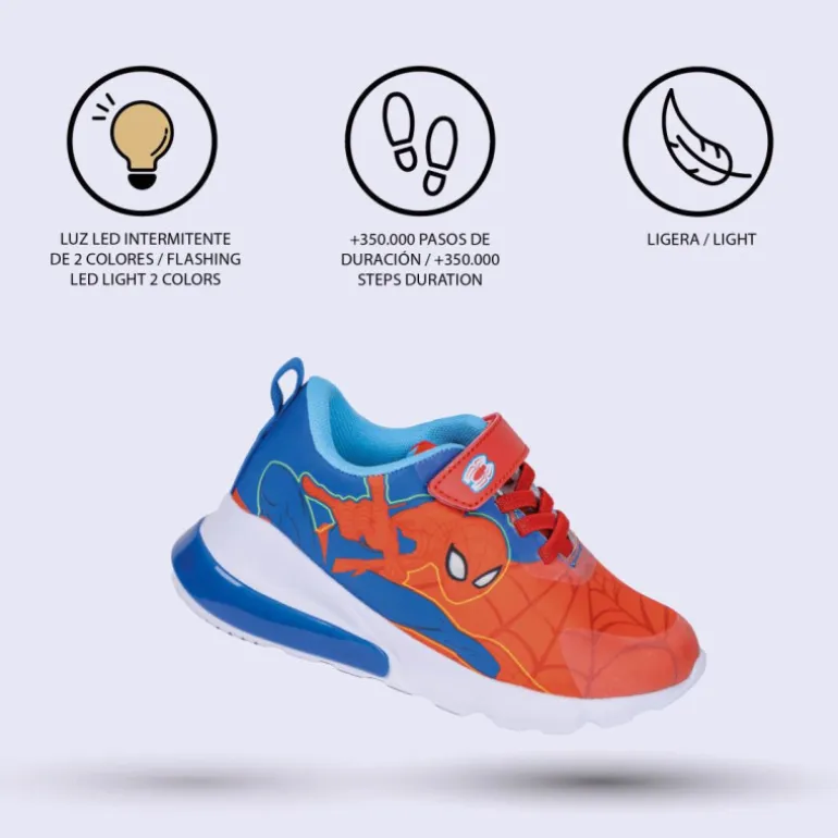 Descubre las deportivas con luces de Spider-Man, perfectas para los pequeños héroes en casa. Estas zapatillas combinan diseño y funcionalidad con su vistosa imagen de Spider-Man en tonos rojos y azules. Fabricadas con materiales de calidad como PU y poliéster, ofrecen una suela ligera de EVA que garantiza comodidad y resistencia al desgaste.