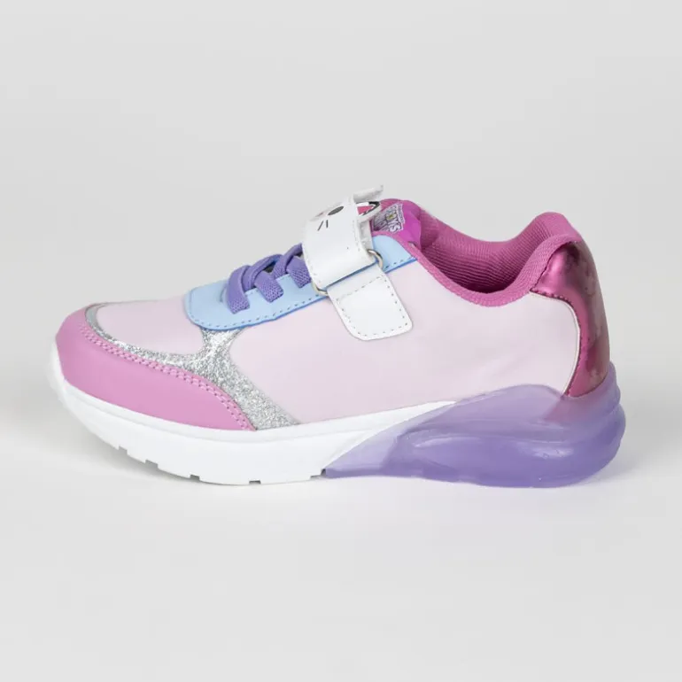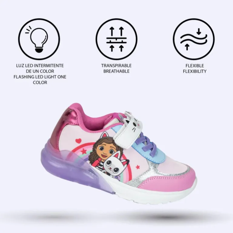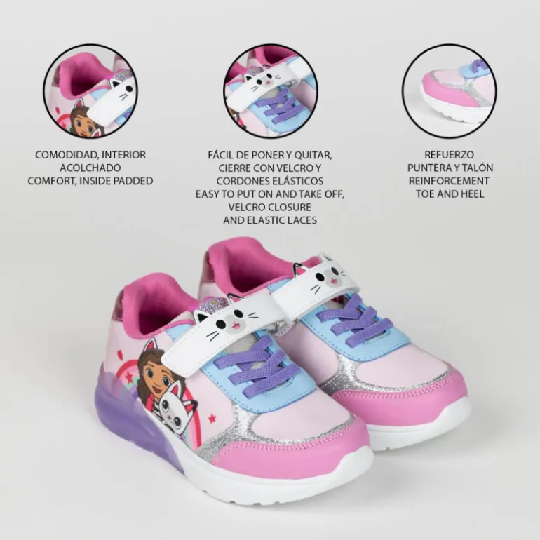 Descubre las encantadoras deportivas con luces inspiradas en Gabby’s Dollhouse. Estas zapatillas presentan un diseño atractivo con una combinación de colores en rosa, lila y plateado, perfecto para los pequeños fans de este popular show. En el lateral, se destaca una colorida ilustración de Gabby junto a su gatito, rodeada de un divertido arcoíris y detalles de estrellas y corazones.