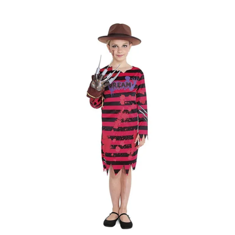 El vestido lleva impresa la palabra «Dream» con un diseño goteante que simula sangre, dándole un aire aún más aterrador y divertido para las fiestas de disfraces. Aunque el disfraz no incluye sombrero, guante ni calzado, puedes complementar el look completo con accesorios adicionales.