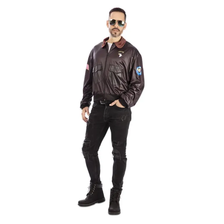 Despega hacia la aventura con este impresionante disfraz de aviador para hombre. La pieza central es una chaqueta de estilo aviador fabricada en un material que imita la piel, con un acabado en color marrón oscuro. Destacan los detalles como las insignias bordadas, que aportan un toque auténtico al estilo militar. La chaqueta incluye prácticos bolsillos frontales y un cierre de cremallera que facilita su uso. El cuello está diseñado en un tono marrón más claro, añadiendo un contraste elegante y distintivo.