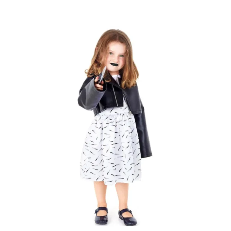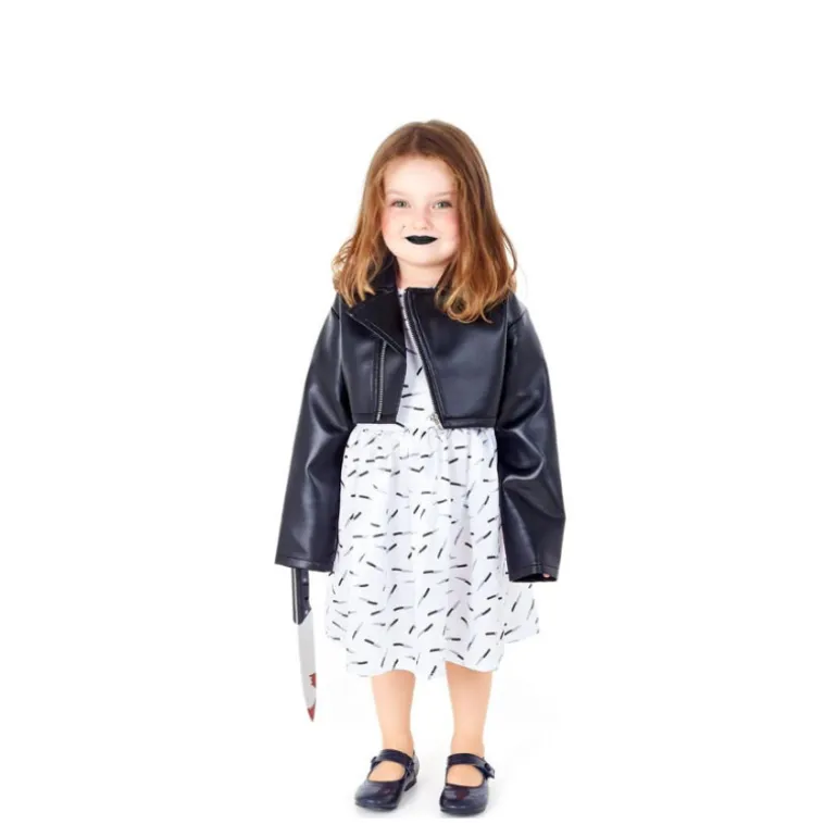 Este encantador disfraz para bebé combina elementos oscuros y juguetones, ideal para el próximo Halloween o cualquier evento temático. El conjunto incluye un vestido blanco con divertido estampado de pequeños trazos en negro que aporta un toque original y moderno. La chaqueta negra, inspirada en un estilo rockero, completa el atuendo con un aire desafiante y a la moda.