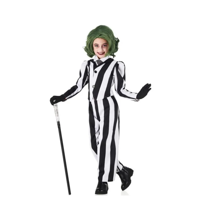 Este disfraz de Bitelchús para niña es perfecto para Halloween o cualquier fiesta temática. El conjunto incluye una chaqueta, pechera, pantalones y corbata, todos con el icónico diseño de rayas verticales en blanco y negro, que captura a la perfección el estilo del famoso personaje.