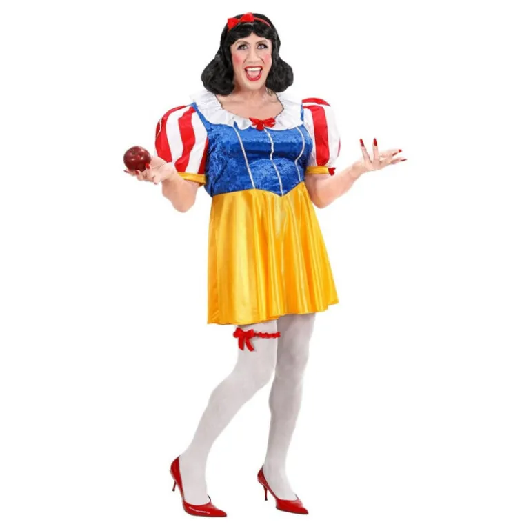 Este disfraz de Blancanieves para hombre es perfecto para aquellos que buscan un toque de humor y originalidad en su próximo evento. El conjunto incluye un encantador vestido con un diseño icónico, una liga, y un tocado, recreando el clásico look de cuento de hadas.