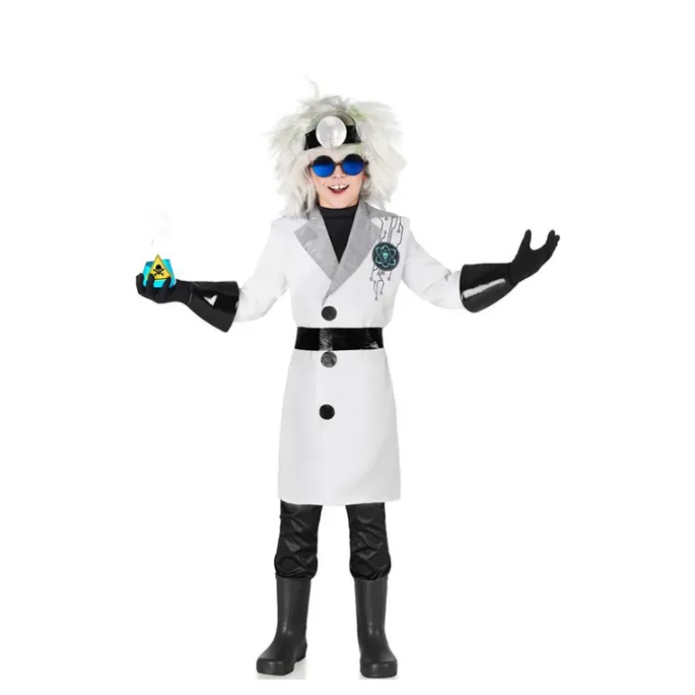 Deja que tu pequeño recree las aventuras de un auténtico viajero del tiempo con este disfraz de Doc Brown inspirado en la icónica película «Regreso al Futuro». Este conjunto detalladamente diseñado incluye una chaqueta blanca con detalles negros y plateados, simulando una bata de científico, ideal para desatar la imaginación. El cuello y los pantalones complementan a la perfección el look clásico del personaje.