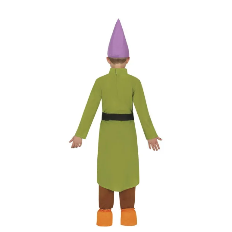 Transforma a tu hijo en uno de los enanitos más queridos del cuento clásico con este encantador disfraz de Enanito de Blancanieves. El conjunto incluye una túnica verde con un diseño asimétrico y cierre en la parte trasera, adornada con botones amarillos en el frontal que le aportan un toque auténtico. Un gorro puntiagudo morado completa el look distintivo de los enanitos. Además, se incluye un cinturón negro con hebilla para ajustar la túnica perfectamente al cuerpo de tu pequeño.