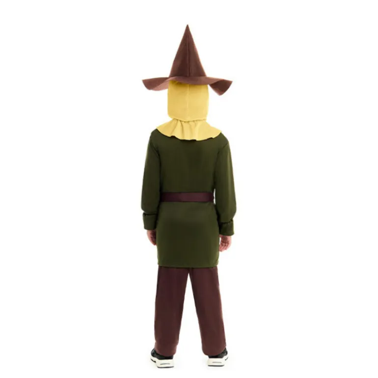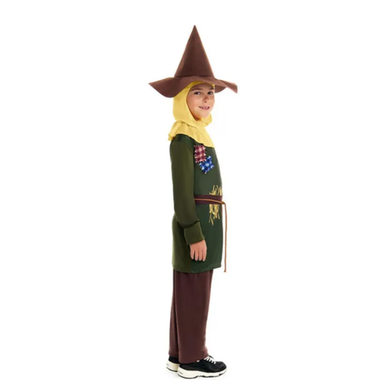 El disfraz se completa con un sombrero con capucha en tonos marrón y amarillo, brindando un toque auténtico y divertido a la vez. Este sombrero cuenta con una forma cónica clásica, característica indispensable para cualquier espantapájaros.