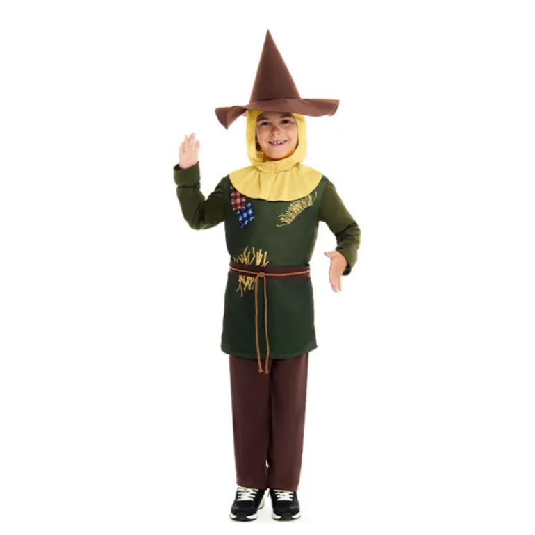 Este encantador disfraz de espantapájaros para niño es perfecto para Halloween, fiestas de disfraces o cualquier evento temático. El conjunto incluye una camiseta de color verde oscuro que simula remiendos con estampados en tonos azules y dorados, junto con un cinturón marrón que complementa el diseño. Los pantalones marrón oscuro están diseñados para ofrecer comodidad y estilo.