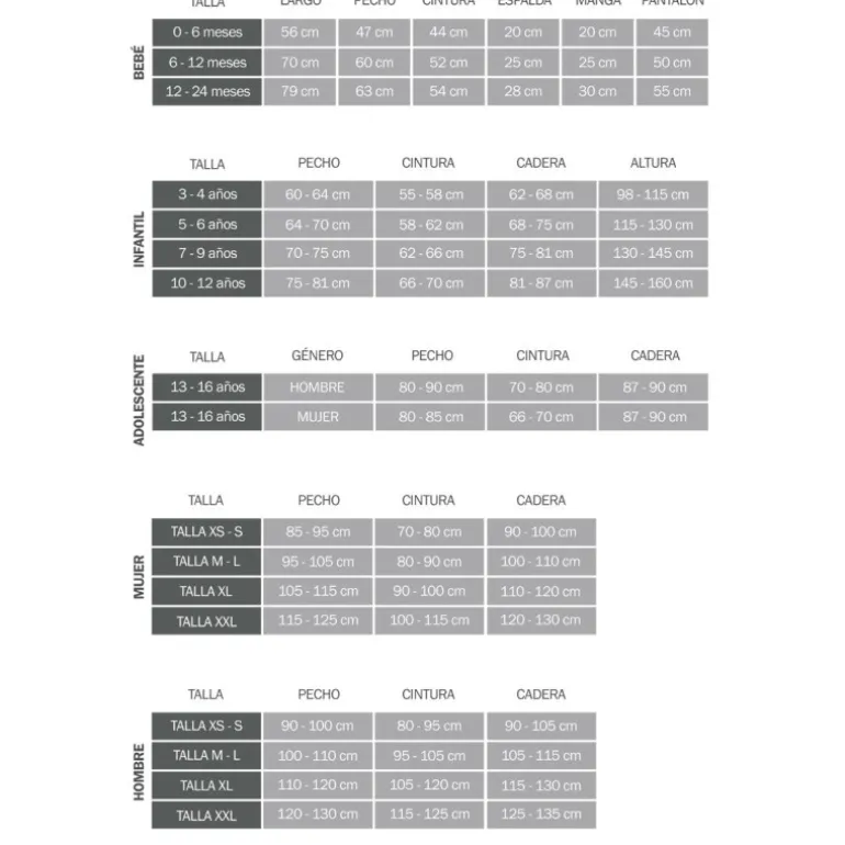 Disponemos de una guía de tallas para asegurar el mejor ajuste. Asegúrate de encontrar la talla perfecta para ti revisando nuestras tablas con las medidas de pecho, cintura y cadera.