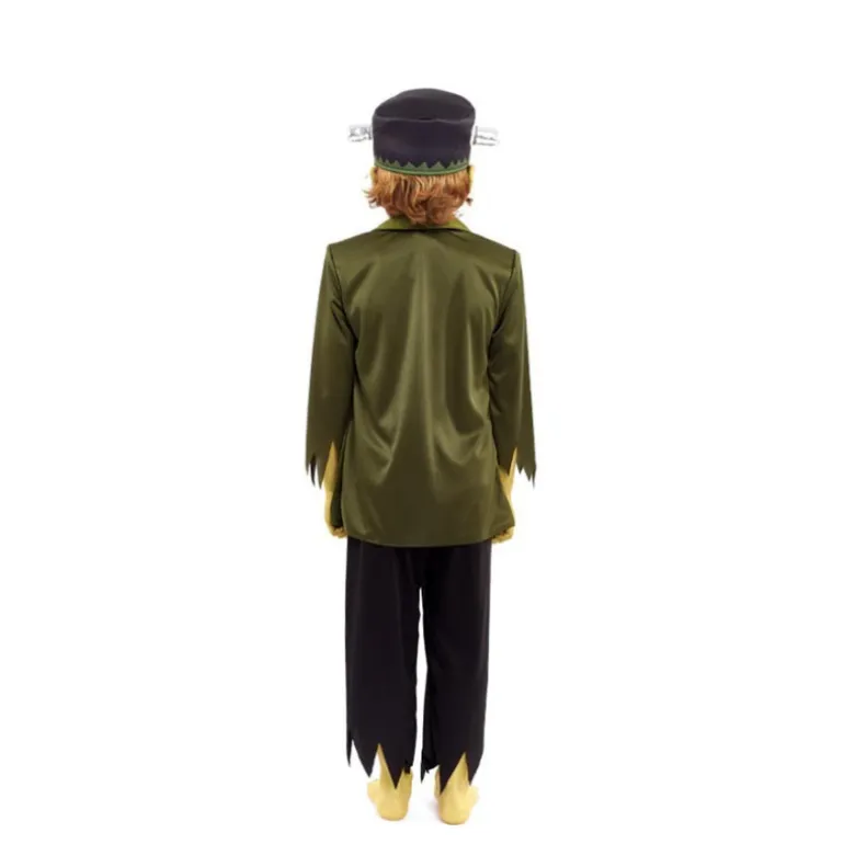 El gorro es de color negro con detalles en forma de tuercas plateadas a los lados, simulando los conocidos pernos del monstruo. La camiseta, de un color marrón oscuro, se acompaña de un chaleco verde oliva, ambos con un diseño que refleja el estilo destartalado y clásico de Frankenstein. Los pantalones, de color negro, tienen un acabado irregular en los tobillos para añadir autenticidad al disfraz.