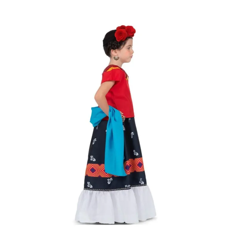 Inspira a tu pequeña con este encantador disfraz de Frida Kahlo. Diseñado para niñas y bebés, este conjunto incluye un tocado de flores rojas vibrantes, un chal azul, una camiseta roja con detalles amarillos, y una falda negra con patrones coloridos. La falda es larga, adornada con patrones geométricos en rojo y detalles en blanco, terminando en un elegante volado blanco que añade un toque tradicional.