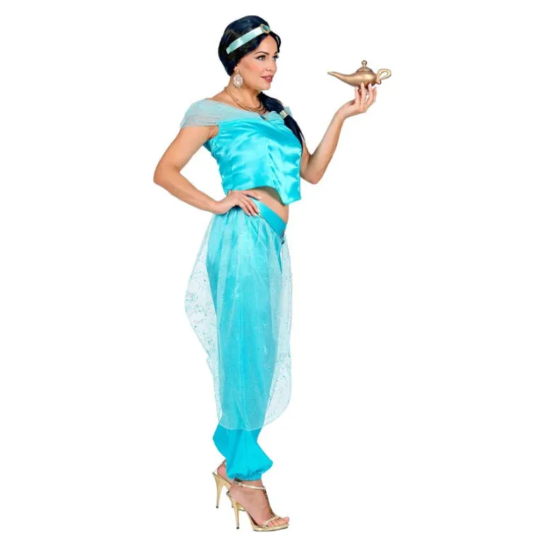 Transforma tu vestuario con este Disfraz de Jasmine para mujer, ideal para fiestas de disfraces, Carnaval o cualquier evento temático. Este encantador conjunto incluye un top de color azul turquesa brillante, diseñado para llevarse al estilo hombros descubiertos, añadiendo un toque de elegancia y autenticidad a tu atuendo. Está acompañado por un pantalón a juego, de corte holgado y también en azul turquesa, que incorpora un delicado velo transparente con detalles brillantes, dándole un aire majestuoso.