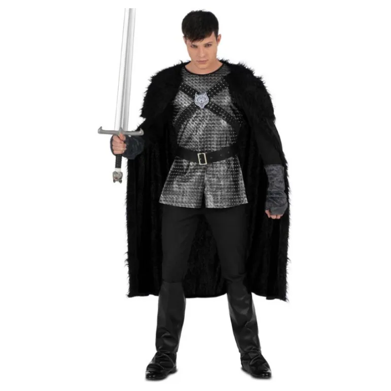 Transpórtate a la era medieval con este impresionante disfraz de caballero en color negro. El conjunto incluye una majestuosa capa con correaje que aporta un aire imponente y dramático. La túnica es de un patrón metálico que simula una auténtica cota de malla, realzada por un distintivo broche en el pecho.