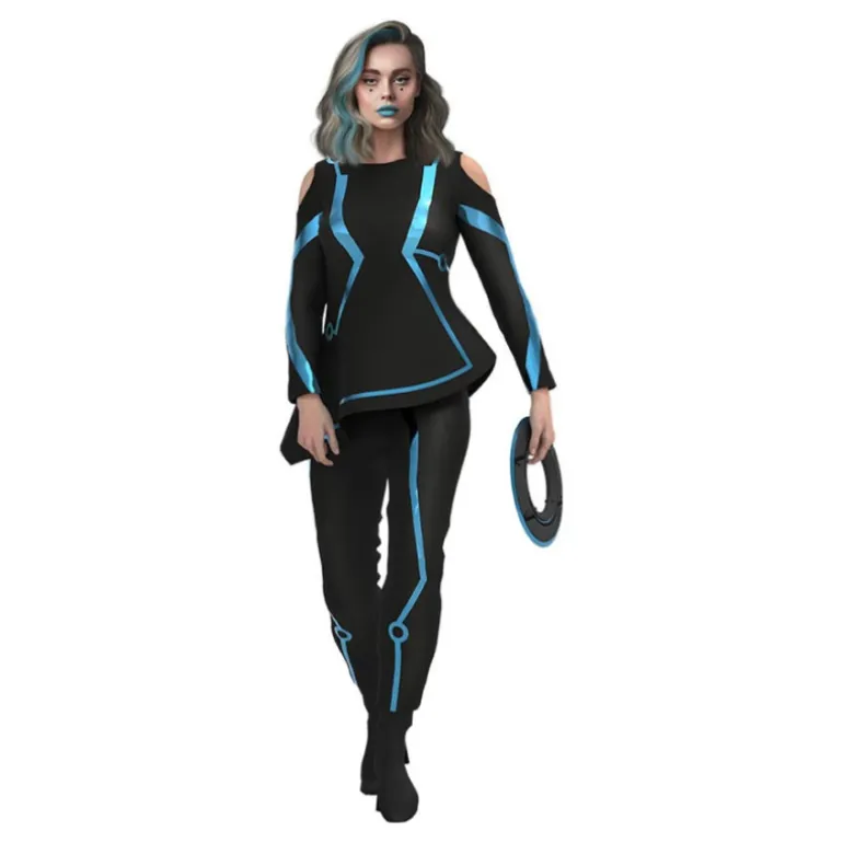 Transforma tu estilo con este disfraz de jugadora de videojuegos diseñado especialmente para mujeres. El conjunto presenta un elegante vestido negro combinado con detalles en azul vibrante, creando un contraste futurista. La forma del vestido es ergonómica, con mangas largas y aberturas en los hombros que añaden un toque de modernidad y originalidad. Los pantalones negros están decorados con líneas y círculos azules, ofreciendo un look dinámico e impactante.