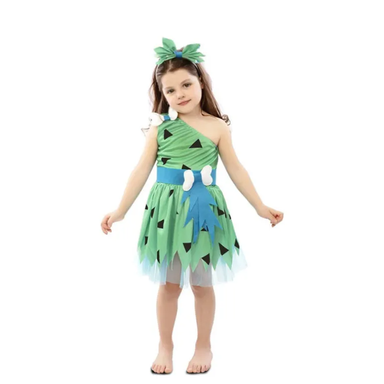 Convierte a tu pequeña en una auténtica cavernícola con este encantador disfraz de Los Picapiedra. Este conjunto incluye un vestido verde de diseño asimétrico adornado con pequeños triángulos negros que le dan un toque prehistórico muy auténtico. El vestido está complementado con un llamativo cinturón azul decorado con detalles en forma de hueso, ideales para imitar el estilo icónico de la famosa serie.