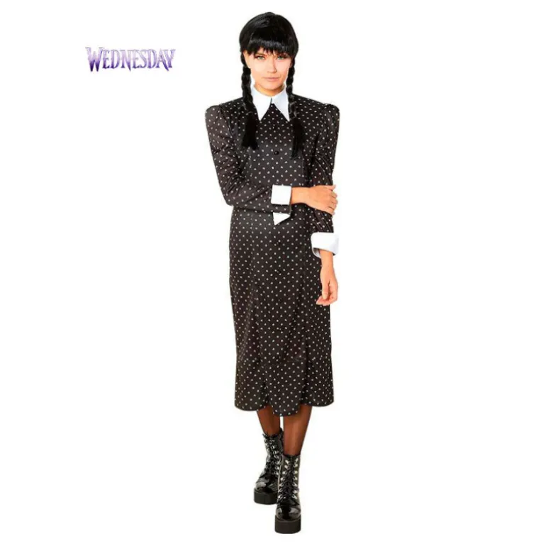 Transforma tu look con el icónico disfraz de Miércoles Addams, inspirado en el legendario personaje de La Familia Addams. Este elegante vestido presenta un diseño de lunares blancos sobre fondo negro, que aporta un toque clásico y a la vez moderno. El atuendo incluye un cuello blanco contrastante que realza su estilo auténtico, evocando la esencia del misterioso y sofisticado mundo de los Addams.