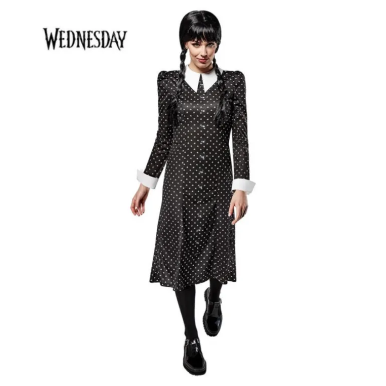 Te presentamos el Disfraz de Miércoles con un diseño clásico que captura la esencia icónica de este personaje. El vestido está confeccionado en un elegante color negro adornado con pequeños puntos blancos que le aportan un toque distintivo. Cuenta con un cuello blanco de estilo camisero que resalta en contraste, al igual que los puños de las mangas largas, proporcionando un acabado impecable y auténtico. El corte del vestido es de longitud media, asegurando comodidad y un ajuste favorecedor para diferentes tipos de cuerpo.