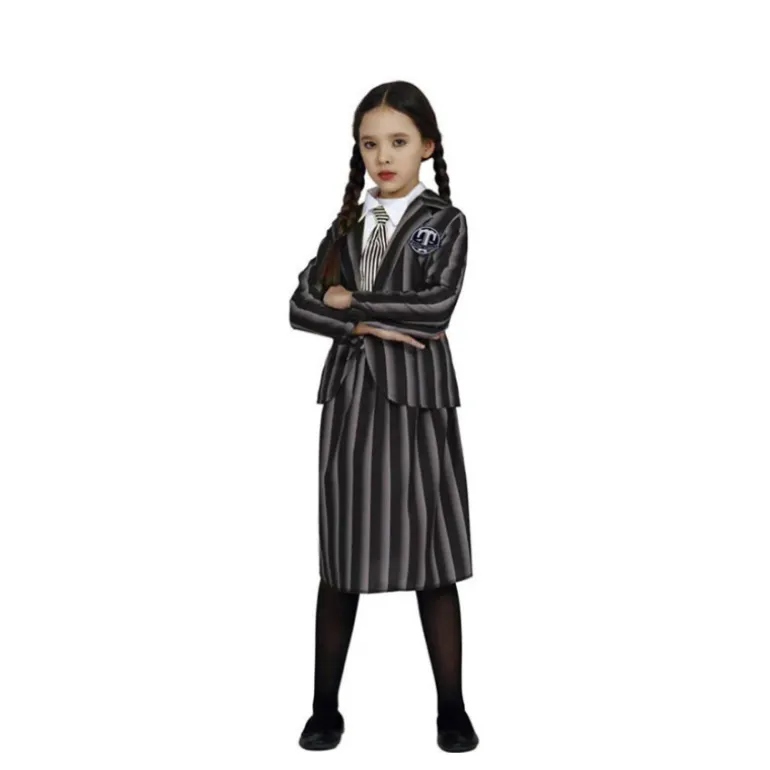 Transforma cada día en una ocasión especial con este impresionante disfraz de niña siniestra colegial. El conjunto incluye una elegante chaqueta con un diseño a rayas en tonos oscuros, ideal para captar la esencia misteriosa del personaje. La camisa blanca con corbata anudada añade un toque sofisticado y encantador, mientras que la falda a juego completa este fascinante atuendo escolar.