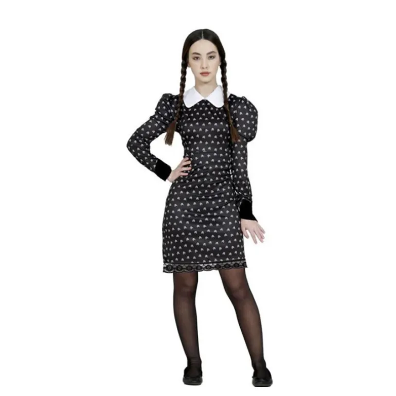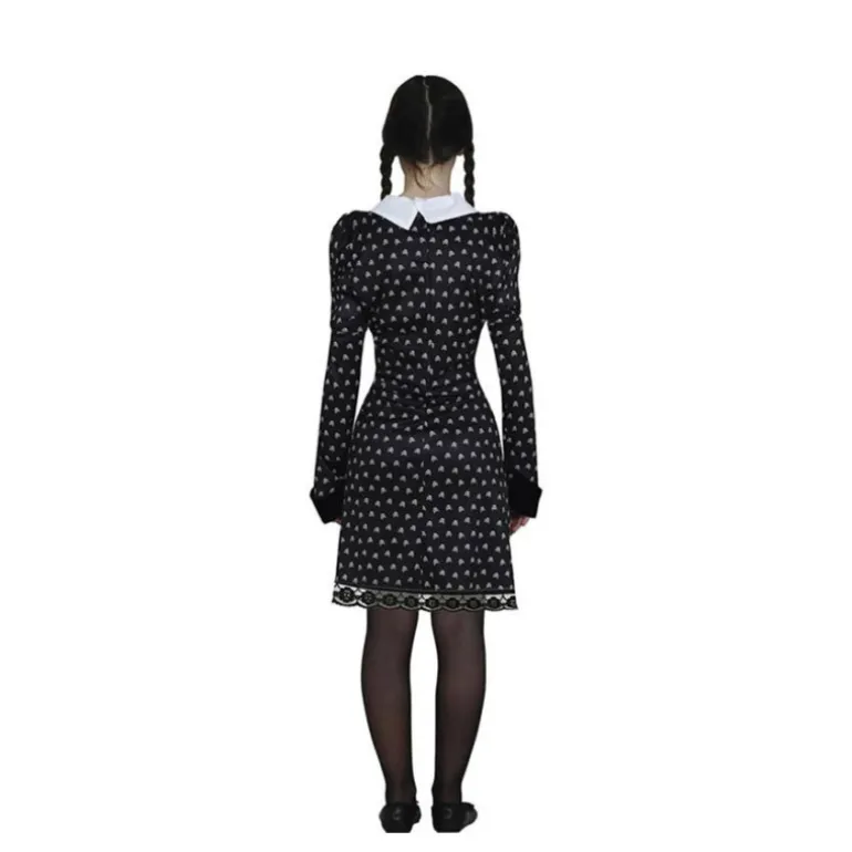 Transforma cualquier evento en una experiencia inolvidable con este Disfraz de Niña Siniestra diseñado especialmente para adolescentes. El vestido presenta un elegante fondo negro adornado con pequeños lunares blancos, evocando el inconfundible estilo de Miércoles. El cuello blanco y los puños contrastan de manera sofisticada, aportando un toque clásico y distintivo al conjunto.