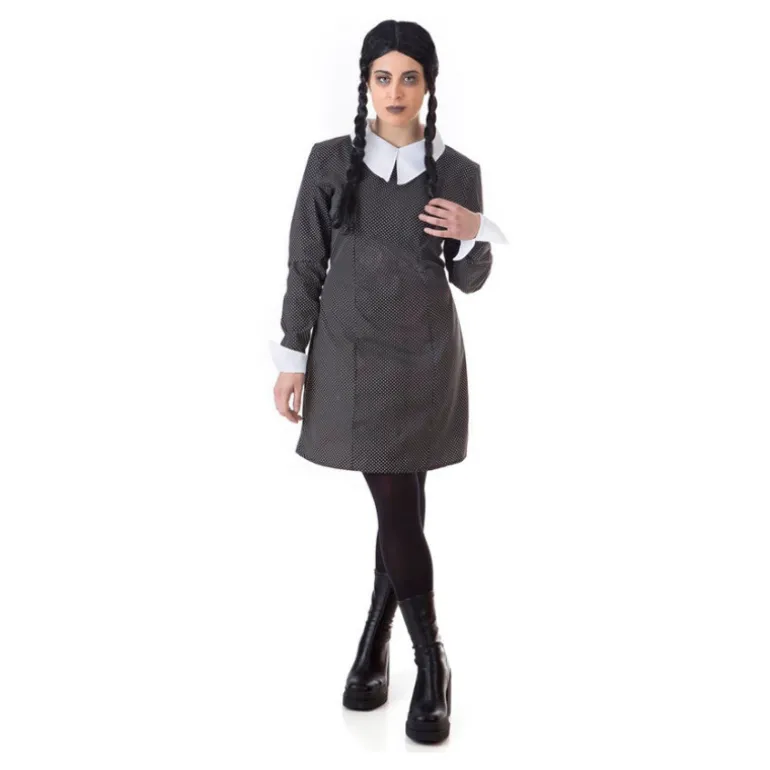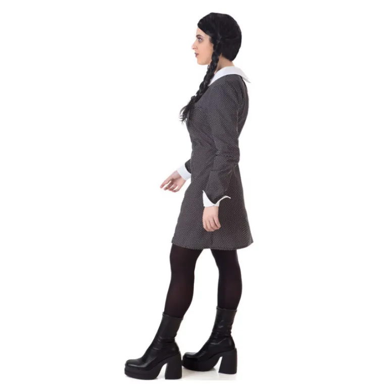 Transfórmate en la icónica niña siniestra con este disfraz de Miércoles Topos Negro para mujer, perfecto para cualquier evento temático o fiesta de Halloween. Incluye un elegante vestido de fondo negro cubierto de pequeños topos blancos, que añade un toque clásico y atemporal. El diseño del vestido presenta un cuello y puños blancos que contrastan de manera sofisticada con el resto del conjunto. Acompañado de una peluca de trenzas que completa el look característico del personaje, este disfraz te ofrece autenticidad y estilo sin igual.