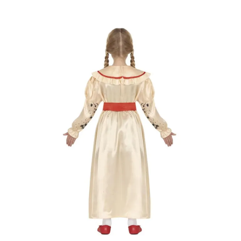 Este terrorífico disfraz de muñeca asesina diabólica para niña es ideal para causar sensación en Halloween o fiestas de disfraces. El conjunto incluye un vestido largo en tono crema con un diseño de manchas negras y rojas, simulando salpicaduras que añaden un toque espeluznante y auténtico al look.