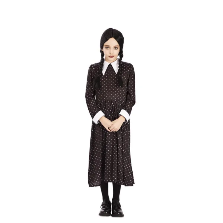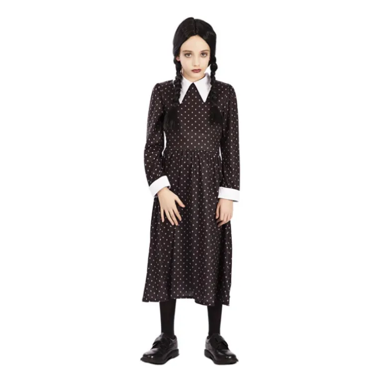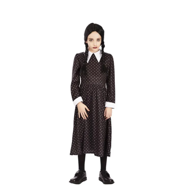 Este elegante disfraz de niña gótica es perfecto para ocasiones especiales como Halloween o fiestas temáticas. El conjunto incluye un encantador vestido largo de color negro con un patrón de lunares blancos. Destaca por su diseño clásico con un cuello blanco en contraste y puños blancos, añadiendo un toque sofisticado al atuendo.