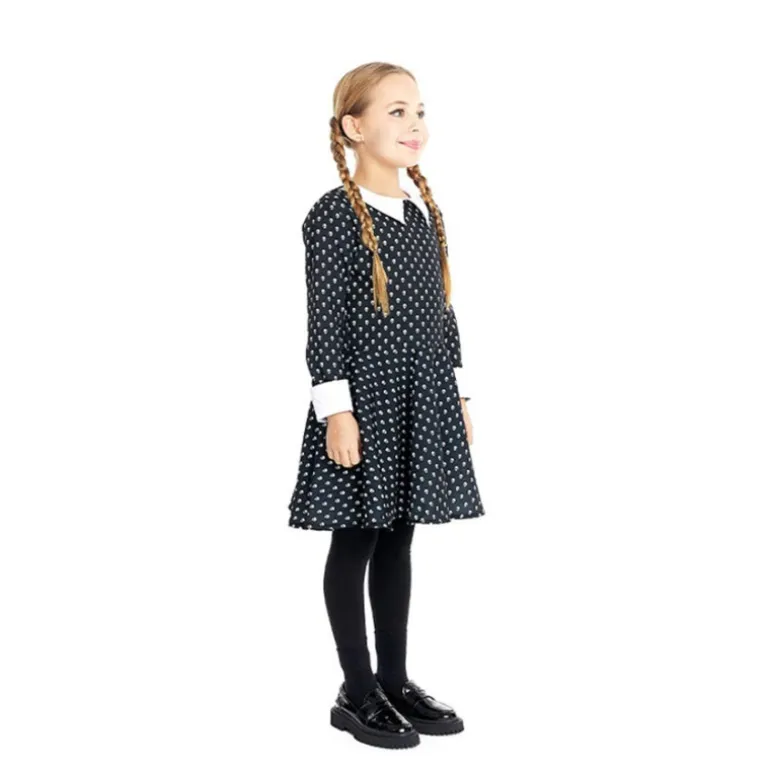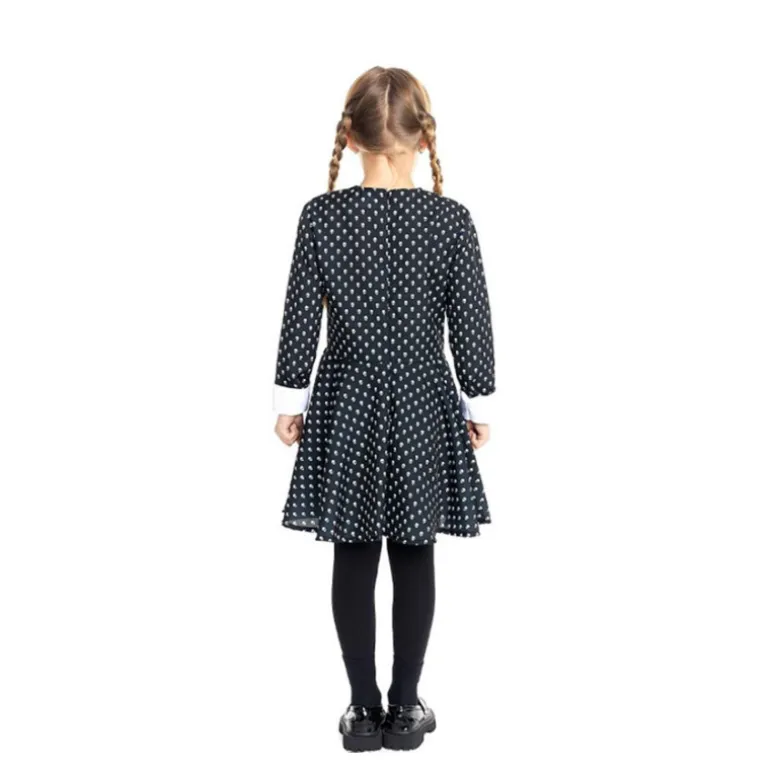 Transforma a tu hija en un personaje misterioso con este disfraz de Miércoles diseñado especialmente para niñas y adolescentes. El vestido presenta un elegante color negro con un estampado de calaveras blancas, perfecto para cualquier ocasión de disfraces. Las mangas largas terminan con puños blancos, haciendo juego con el clásico cuello blanco del vestido, que le da un toque inconfundible.