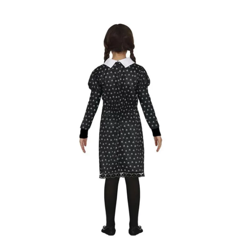 El encantador disfraz de Niña Siniestra para niña está diseñado para captar la esencia de un personaje icónico. Este disfraz incluye un elegante vestido negro adornado con lunares blancos que resaltan su estilo clásico y misterioso. El corte del vestido es recto y se adapta cómodamente al cuerpo, con mangas largas abullonadas para un toque vintage. Destaca el cuello blanco estilo Peter Pan, que aporta un contraste perfecto y un aire más formal al conjunto.