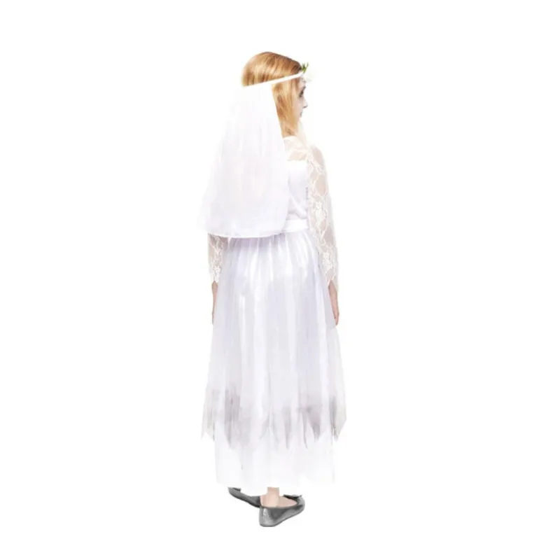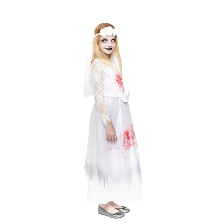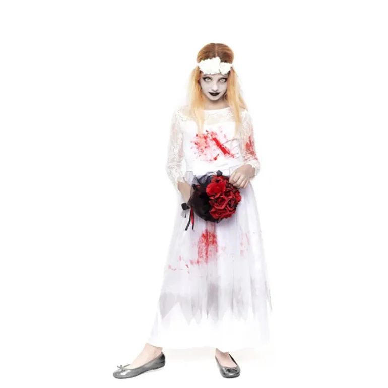 Este disfraz de Novia Cadáver para niña es perfecto para destacar en cualquier evento temático o fiesta de disfraces. El conjunto incluye un vestido blanco con detalles en encaje en las mangas que añaden un toque elegante y misterioso. Los detalles de sangre en la parte delantera del vestido crean un look espeluznante y auténtico. El disfraz se completa con un velo blanco, sujeto por una delicada corona de flores blancas, y un cinturón de lazo que acentúa la cintura. Aunque el ramo de flores no está incluido, puedes complementarlo con accesorios adicionales para un look más impactante.