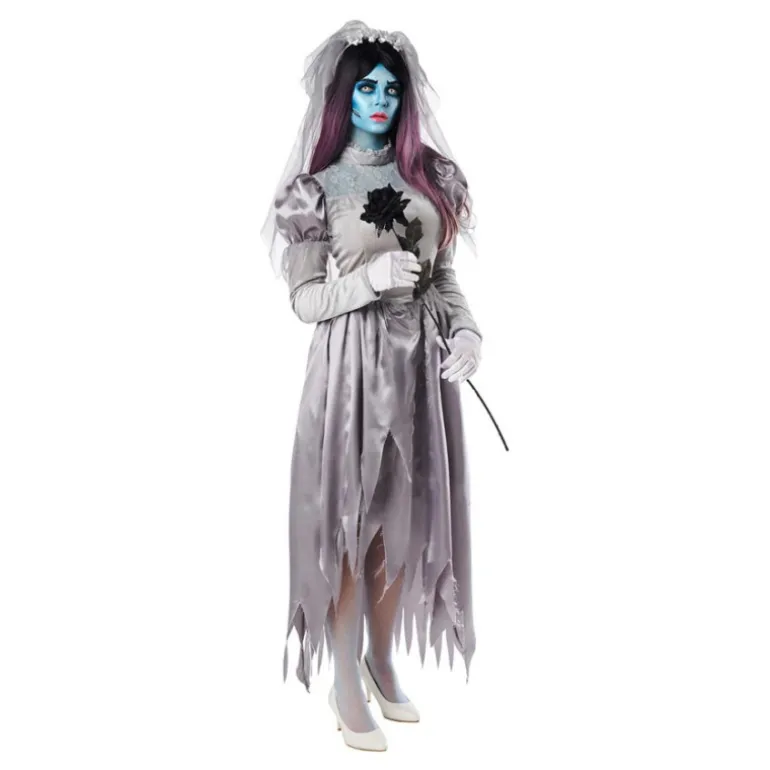 Disfraz de Novia Cadáver sombría para mujer. Incluye Vestido y Diadema. No incluye Peluca, Guantes, Rosa, Medias pantys ni Calzado.