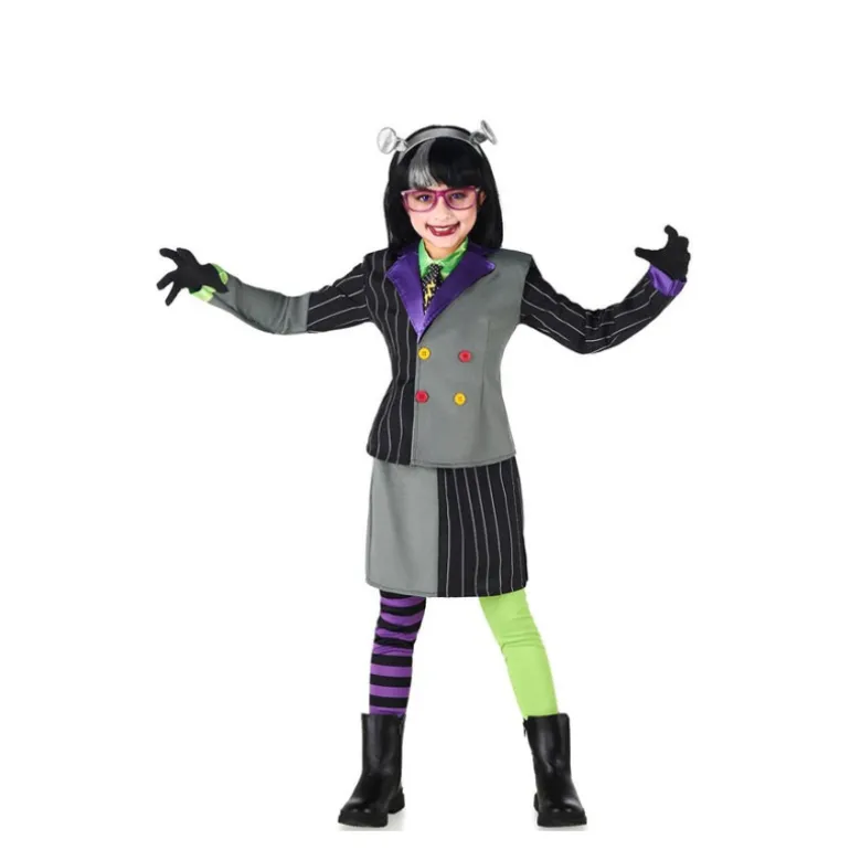 Este encantador disfraz de Novia Frankenstein para niña es una opción perfecta para destacar en cualquier evento temático. El conjunto cuenta con una chaqueta a rayas en tonos oscuros combinada con una pechera de color brillante, ofreciendo un look elegante y divertido. La falda a juego mantiene el diseño de rayas, completando el estilo único del disfraz.