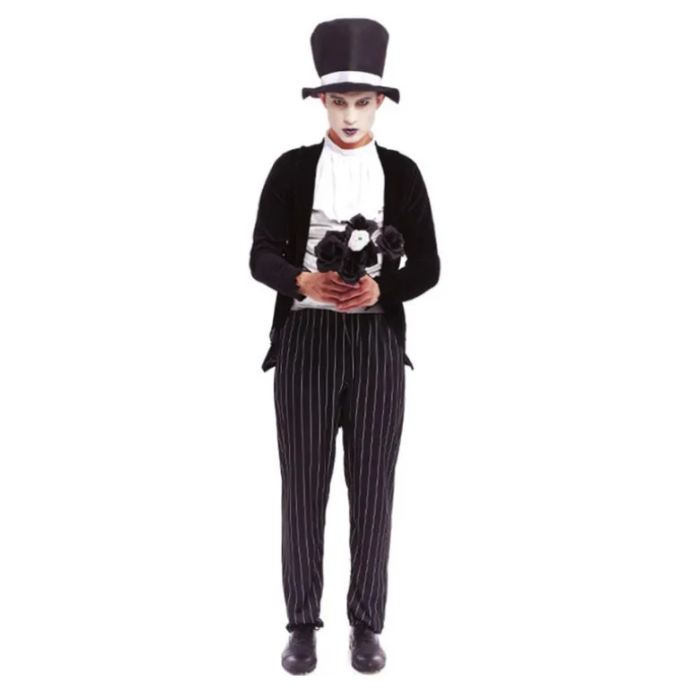 Transforma cualquier evento en una ocasión memorable con este disfraz de Novio Cadáver para hombre. El conjunto incluye un elegante sombrero negro de copa alta que aporta un toque clásico y misterioso al look. La camiseta blanca simula un chaleco con chorrera, proporcionando un aspecto detalladamente elaborado que complementa el atuendo.