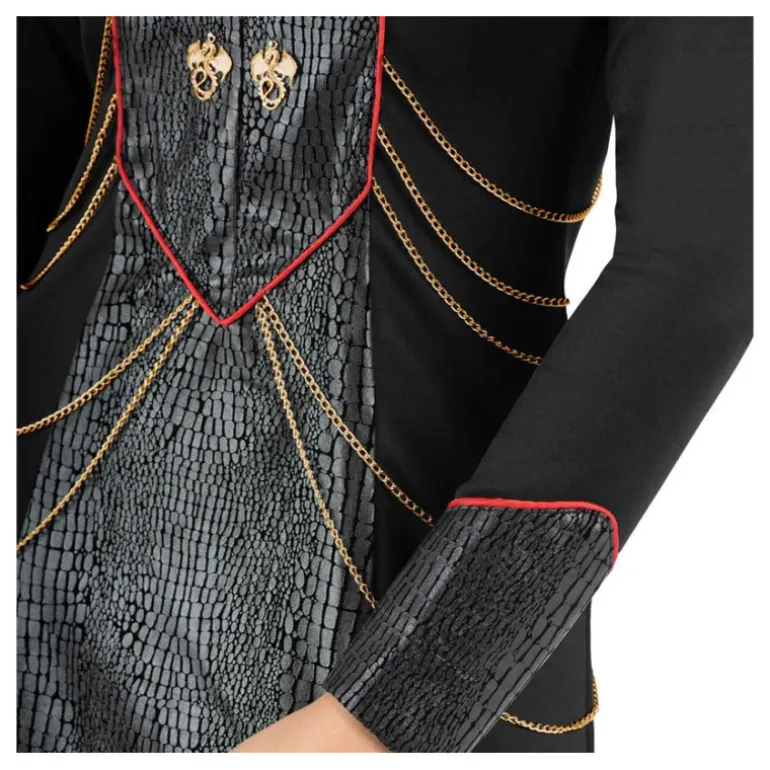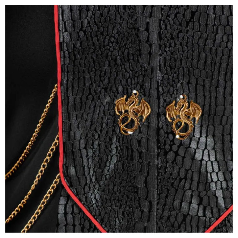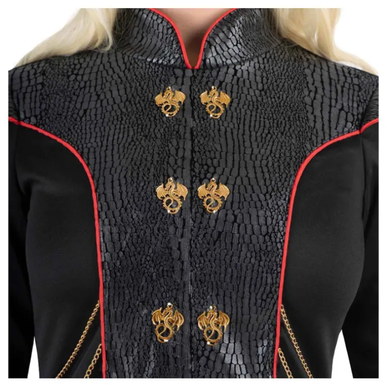 El disfraz incluye un elegante vestido largo negro, diseñado con un tejido que simula escamas, adornado con detalles dorados que asemejan cadenas, brindando un toque sofisticado y poderoso. El vestido cuenta con detalles en rojizo a lo largo de los bordes, añadiendo contraste y elegancia. En el pecho, se destacan los emblemas dorados en forma de dragones, simbolizando fuerza y autoridad.