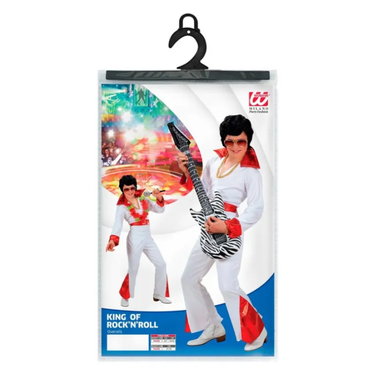 Sumérgete en el estilo único del icónico Rey del Rock and Roll con este impresionante disfraz. El atuendo destaca por su vibrante maillot blanco adornado con deslumbrantes detalles en rojo metálico en el cuello, los puños y las perneras. Este diseño audaz captura la esencia del rock clásico y garantiza que te roben todas las miradas en cualquier evento.