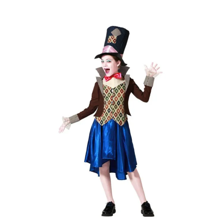 Convierte a tu pequeña en la protagonista de su propia aventura con este encantador disfraz de Sombrerera Loca. El conjunto incluye un elegante sombrero alto negro con detalles de cintas rosas y cuadros en tonos marrones, que complementa perfectamente la viva pajarita roja. La chaqueta marrón añade un toque sofisticado, con el chaleco integrado de estampado geométrico en colores cálidos. La falda azul, con su diseño voluminoso, aporta un aire de fantasía y movimiento.