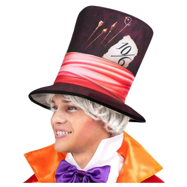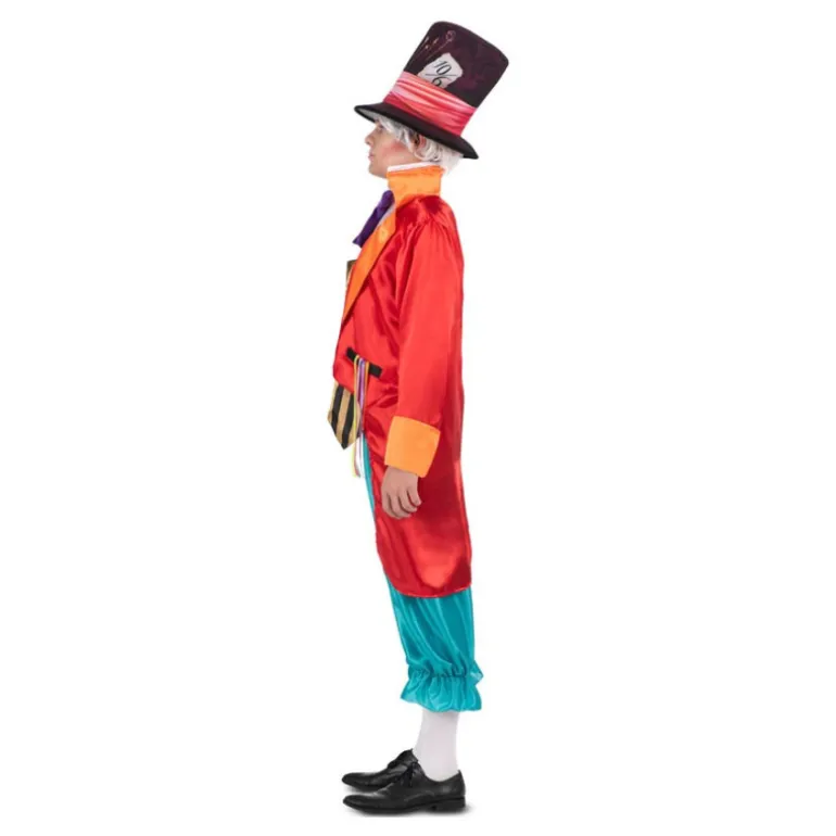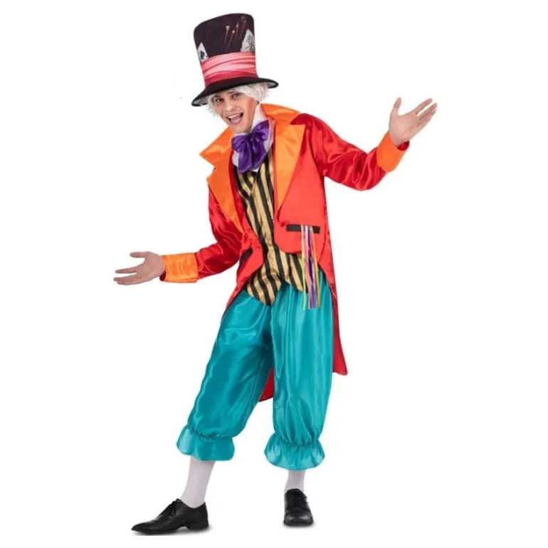 Transforma cualquier evento en una experiencia inolvidable con este disfraz de Sombrerero Loco ideal para los amantes de los clásicos. El conjunto incluye un llamativo sombrero negro adornado con una vistosa cinta roja, una carta de póker y una pluma de pavo real, que exuda originalidad y estilo. Completa el look con un cuello con pajarita de color morado y una chaqueta larga de un intenso color naranja, que junto al chaleco enfatiza un diseño de rayas negras y amarillas.