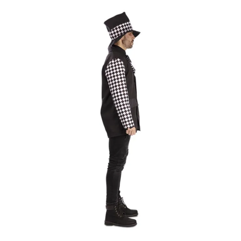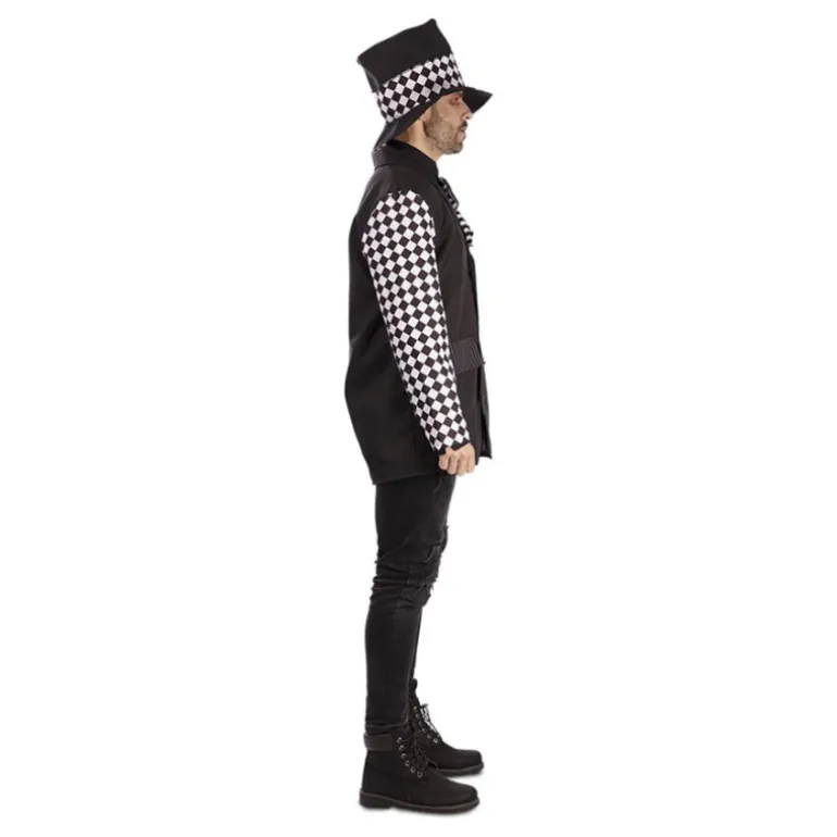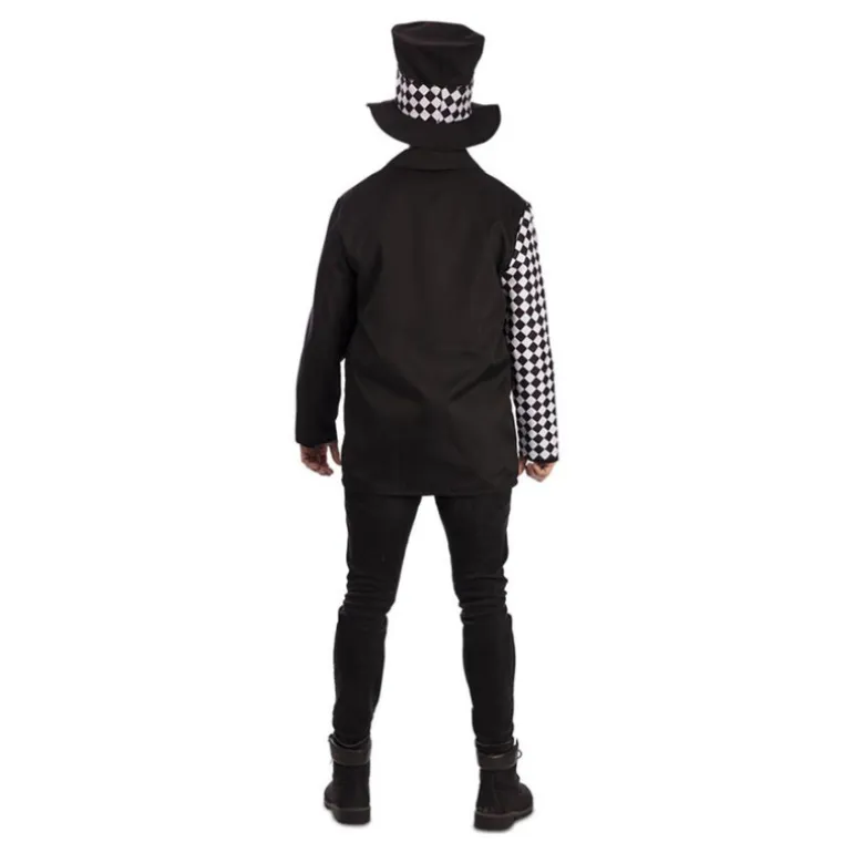Transforma tu apariencia con este sorprendente disfraz de Sombrerero Oscuro, ideal para cualquier evento temático o fiesta de disfraces. Este conjunto incluye un imponente sombrero negro con un diseño de cuadros blancos y negros en la cinta, que añade un toque excéntrico inconfundible. La chaqueta negra está diseñada para impresionar, combinando patrones de rayas en la parte frontal y un bolsillo en contraste que complementa las mangas de cuadros blancos y negros, aportando un look original y único.
