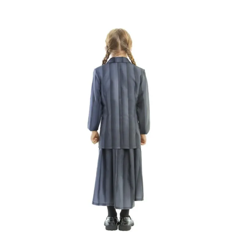 Sumérgete en el misterioso mundo de Miércoles Addams con este disfraz de uniforme a rayas diseñado especialmente para niñas y adolescentes. El conjunto incluye una elegante chaqueta de solapas clásicas y botones frontales, combinada con una falsa camisa blanca que aporta un toque tradicional. La falda a juego es larga y fluida, proporcionando comodidad y movimiento.