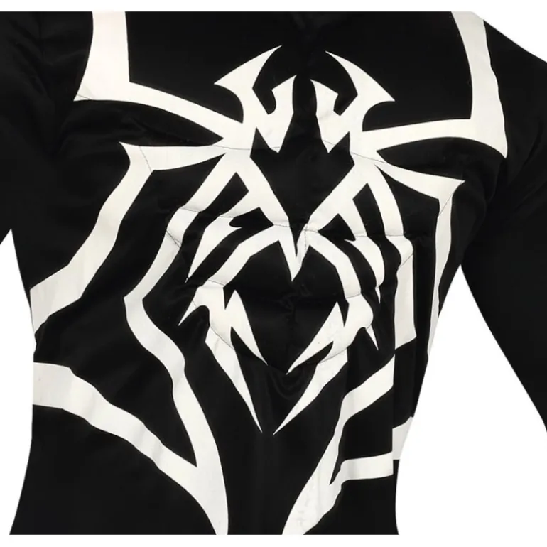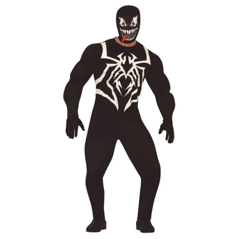 Conviértete en el misterioso héroe arácnido Venom con este impresionante traje oscuro. El disfraz incluye una capucha que cubre completamente la cabeza, decorada con un diseño impactante de ojos blancos y una boca llena de colmillos afilados, añadiendo un toque de peligro y misterio a tu apariencia. El maillot enterizo es completamente negro, destacando un audaz diseño arácnido en blanco en el pecho, perfecto para causar furor en cualquier evento de disfraces.