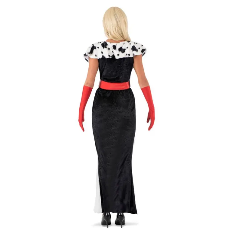 Transforma cualquier ocasión en un evento inolvidable con este **disfraz de villana cruel**. El **vestido** es largo y estilizado, combinando elegancia con un toque atrevido en colores **blanco y negro**, destacando un diseño que recuerda las icónicas manchas de piel. El escote en V y las hombreras ofrecen un aire de sofisticación, mientras que la **cintura** se resalta con un **cinturón rojo** que añade un toque de color vibrante a todo el conjunto.