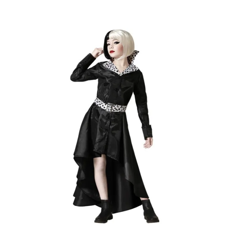 Transpórtate al mundo de los cuentos con este elegante disfraz de Villana Cruel para niña. El conjunto destaca por un vestido negro con un corte asimétrico y una cola larga que le aporta dramatismo y sofisticación. El diseño cuenta con un cuello pronunciado adornado con un estampado de lunares en blanco y negro, que le da un toque distintivo y audaz. El cinturón a juego estiliza la figura y completa el look con elegancia.